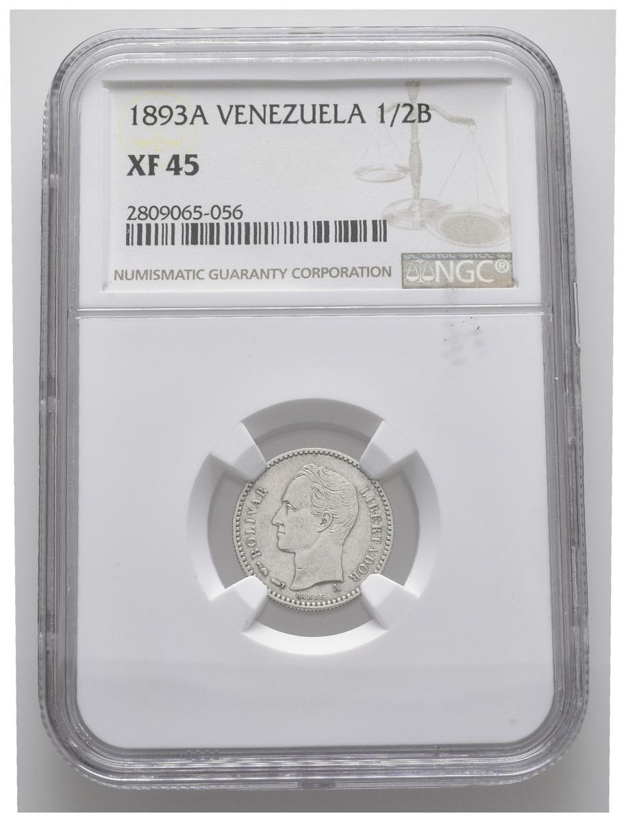 ESTADOS UNIDOS DE VENEZUELA . 1/2 Bolívar. (Ar. 2,50g/18mm). 1893. París A. (Km#Y21). Encapsulado NGC XF-45.
