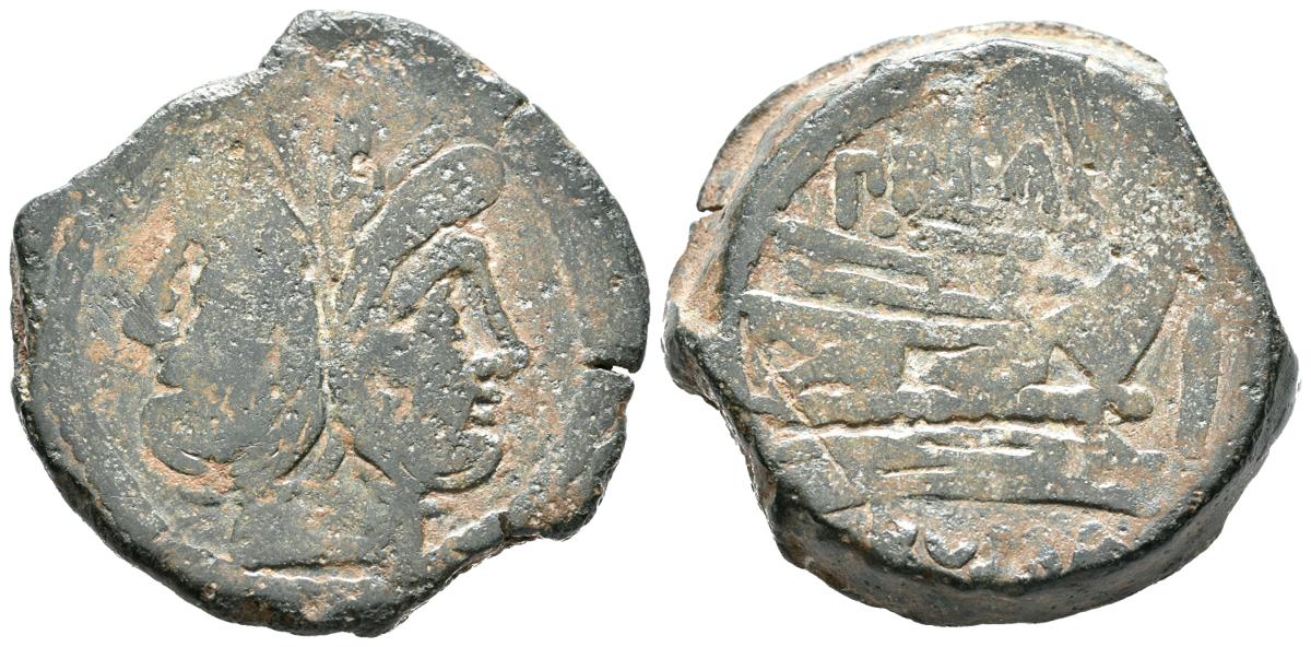 GENS CORNELIA. As. (Ae. 27,41g/32mm). 170-158 a.C. Roma. (Crawford 189/1). Anv: Cabeza bifronte laureada de Jano, encima: I. Rev: Proa a derecha, encima: P BLAS, delante: I, debajo: ROMA. MBC-.