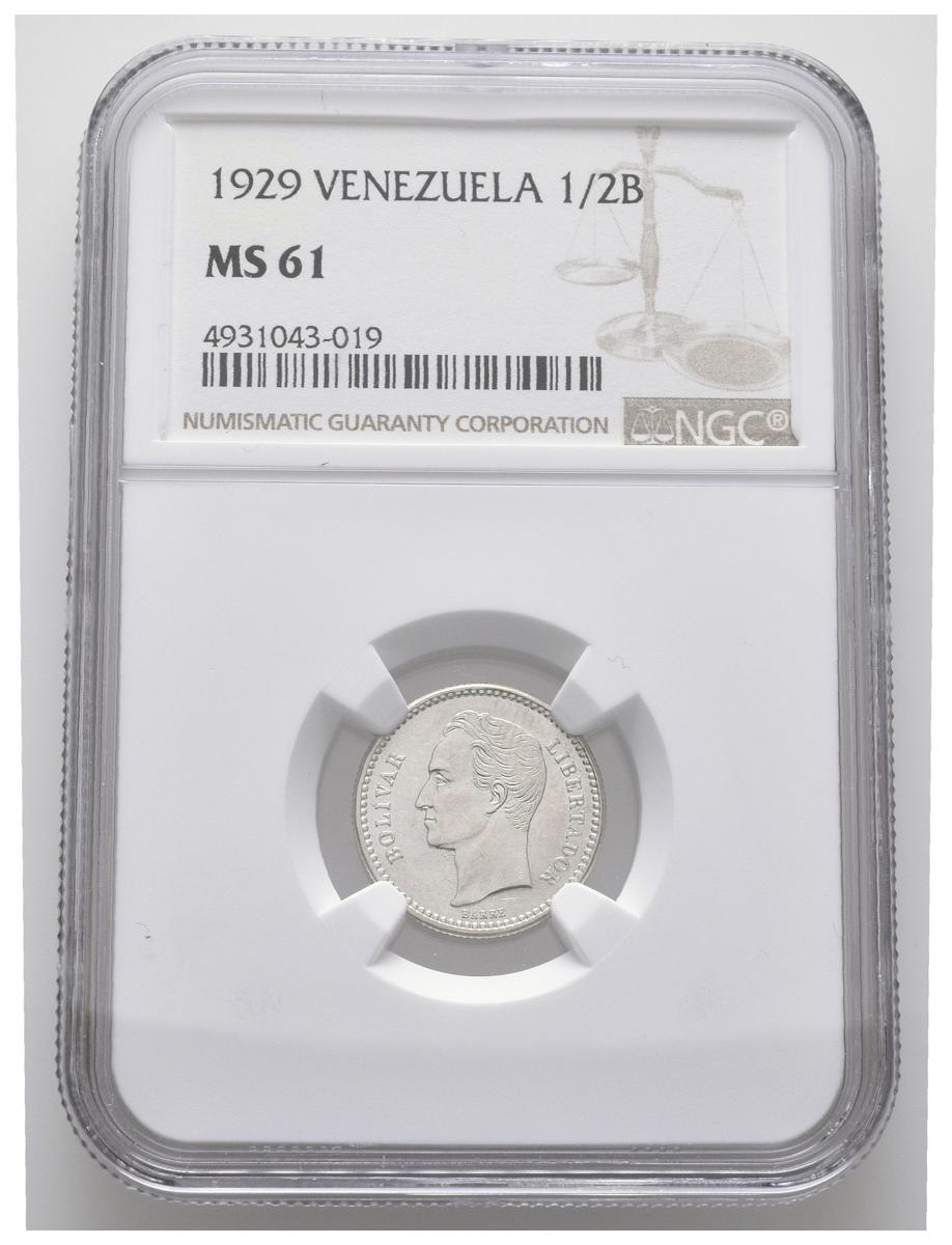 ESTADOS UNIDOS DE VENEZUELA. 1/2 Bolívar. (Ar. 2,50g/18mm). 1929. (Km#Y21). Encapsulado NGC MS-61.