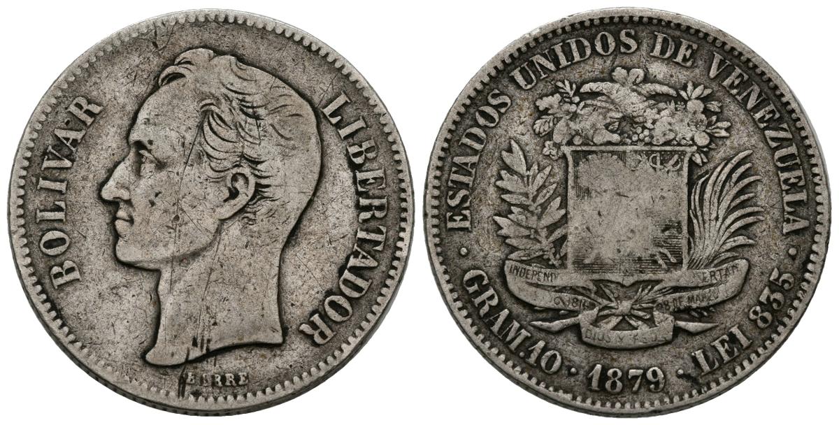 ESTADOS UNIDOS DE VENZUELA. 2 Bolívares (Ar. 9,60g/27mm). 1879. Bruselas. (Km#23). MBC-. Vanos de acuñación.