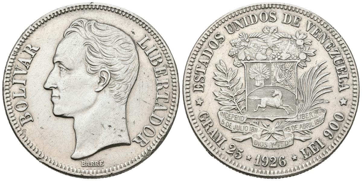 ESTADOS UNIDOS DE VENEZUELA. 5 Bolívares. (Ar. 25,00g/37mm). 1926. Philadelphia. (Km#24.2). MBC+.