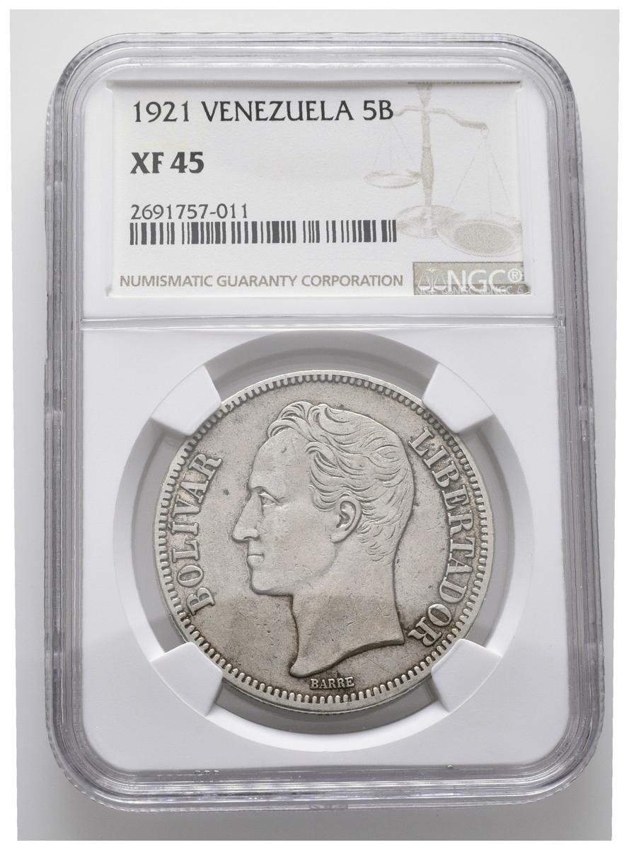 ESTADOS UNIDOS DE VENEZUELA. 5 Bolívares. (Ar. 25,00g/37mm). 1921. Philadelphia. (Km#Y24.2). Encapsulado NGC XF-45.