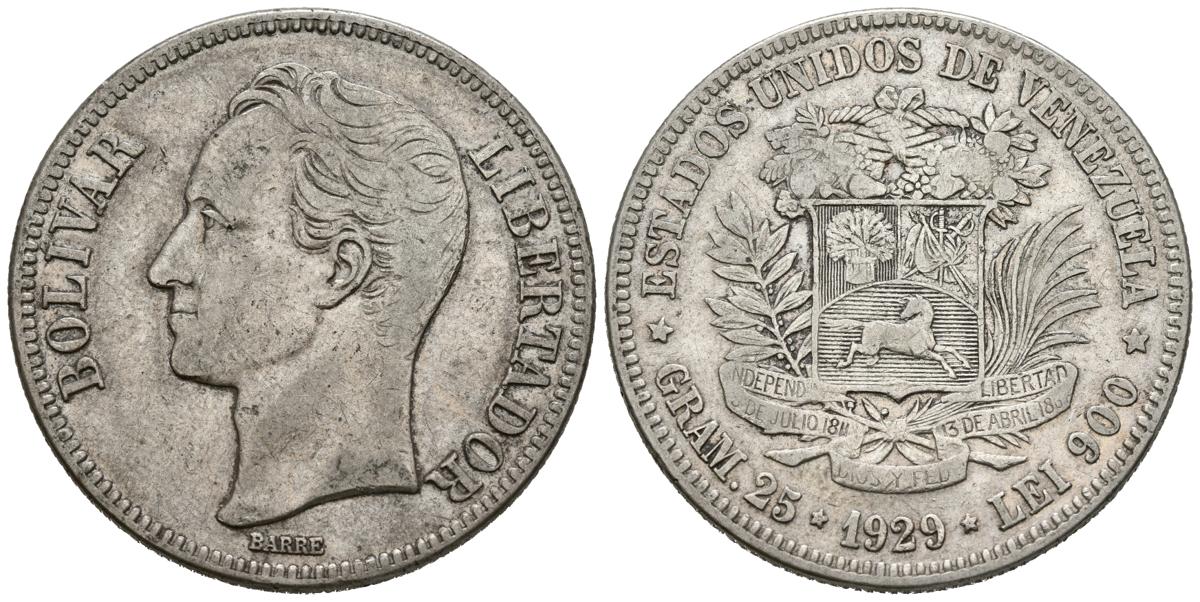 VENEZUELA. 5 Bolívares. (Ar. 24,79g/37mm). 1929. Philadelphia. (Km#24.2). MBC.