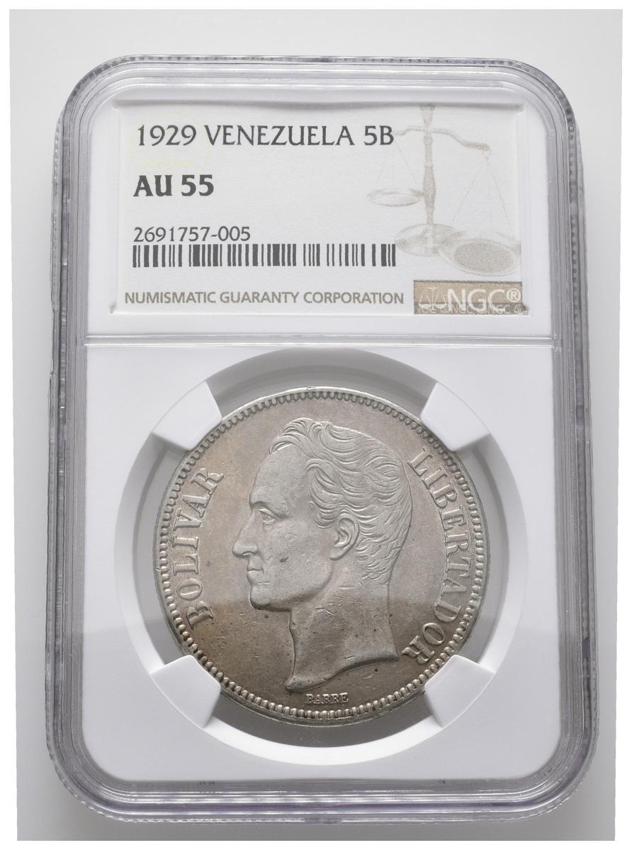 ESTADOS UNIDOS DE VENEZUELA. 5 Bolívares. (Ar. 25,00g/37mm). 1929. Philadelphia. (Km#Y24.2). Encapsulado NGC AU-55.
