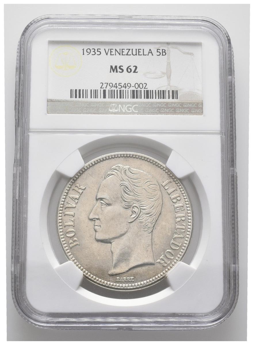 ESTADOS UNIDOS DE VENEZUELA. 5 Bolívares. (Ar. 25,00g/37mm). 1935. Philadelphia. (Km#Y24.2). Encapsulado NGC MS-62.