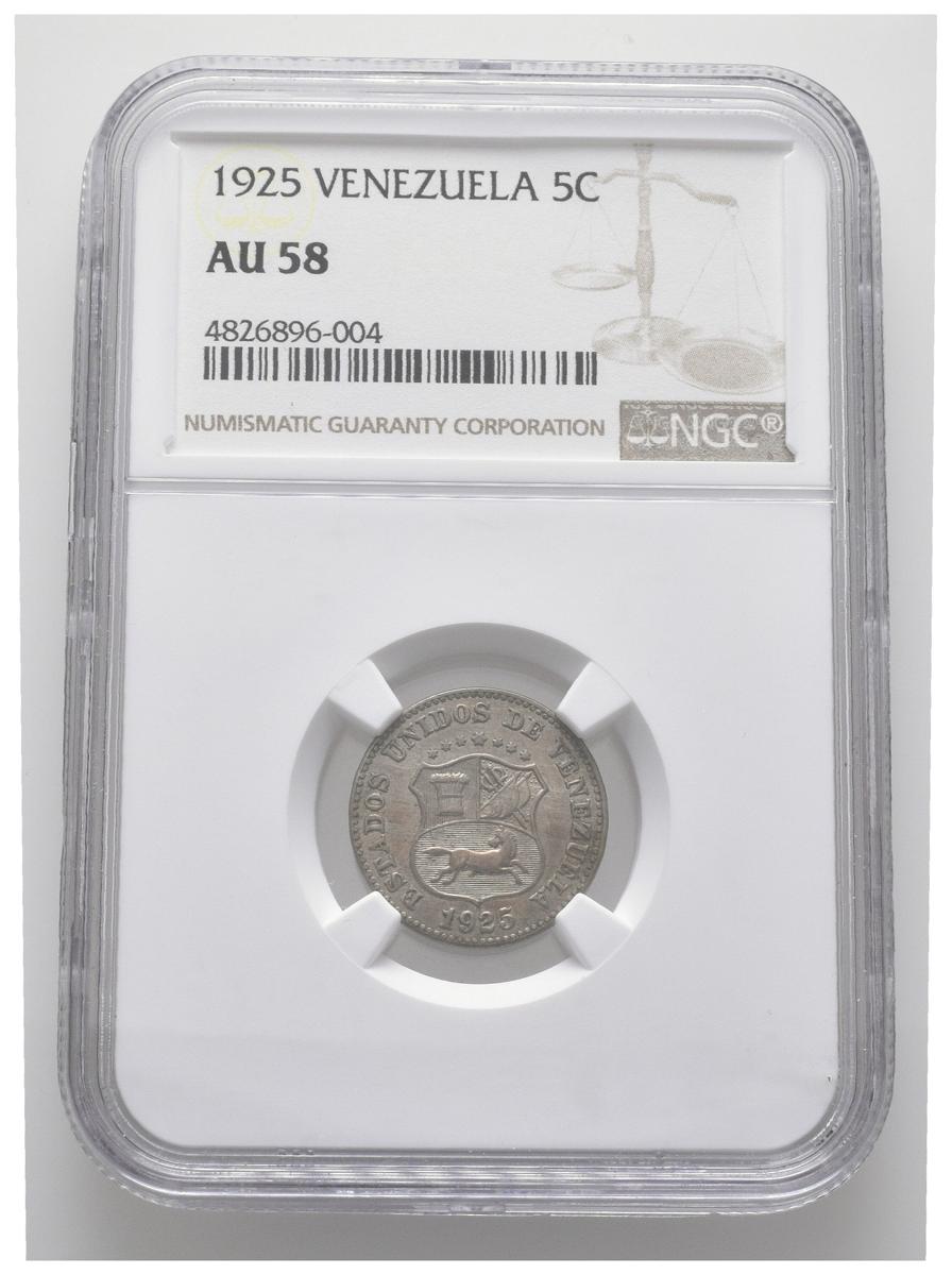 ESTADOS UNIDOS DE VENEZUELA. 5 Céntimos. (CuNi. 2,30g/19mm). 1925. Philadelphia. (Km#Y27). Encapsulado NGC AU-58.