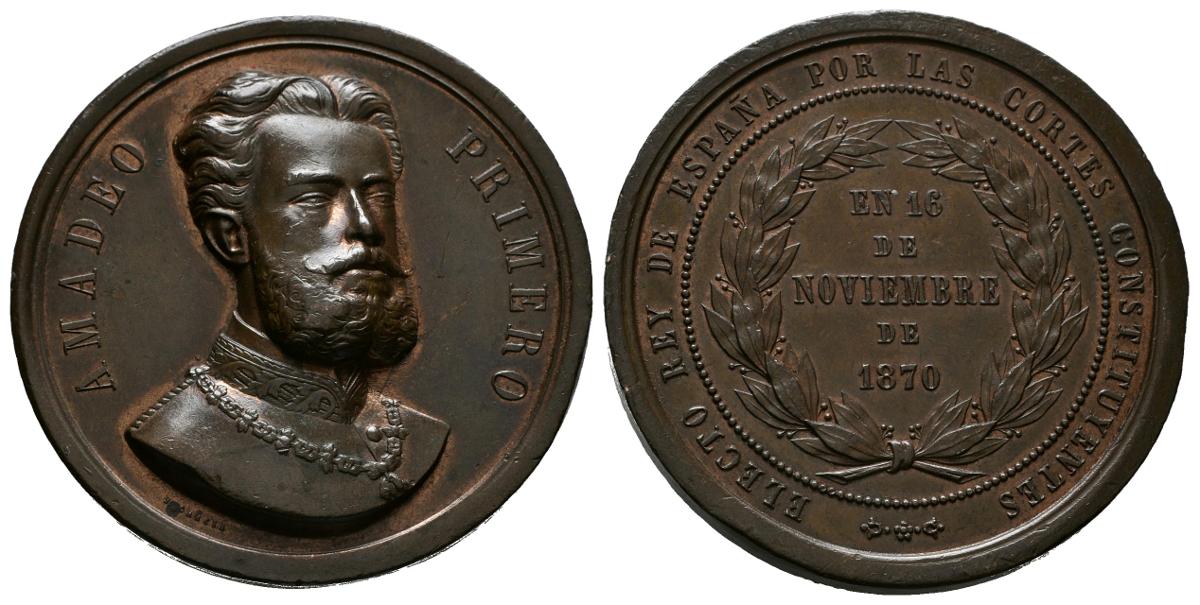 AMADEO I (1871-1873). Proclamación. (Ae. 56,34g/42mm). 16 de Noviembre de 1870. Madrid.Grabador: J. García Morado. (Vives 832; RAH 670). EBC. Marquitas. Escasa.