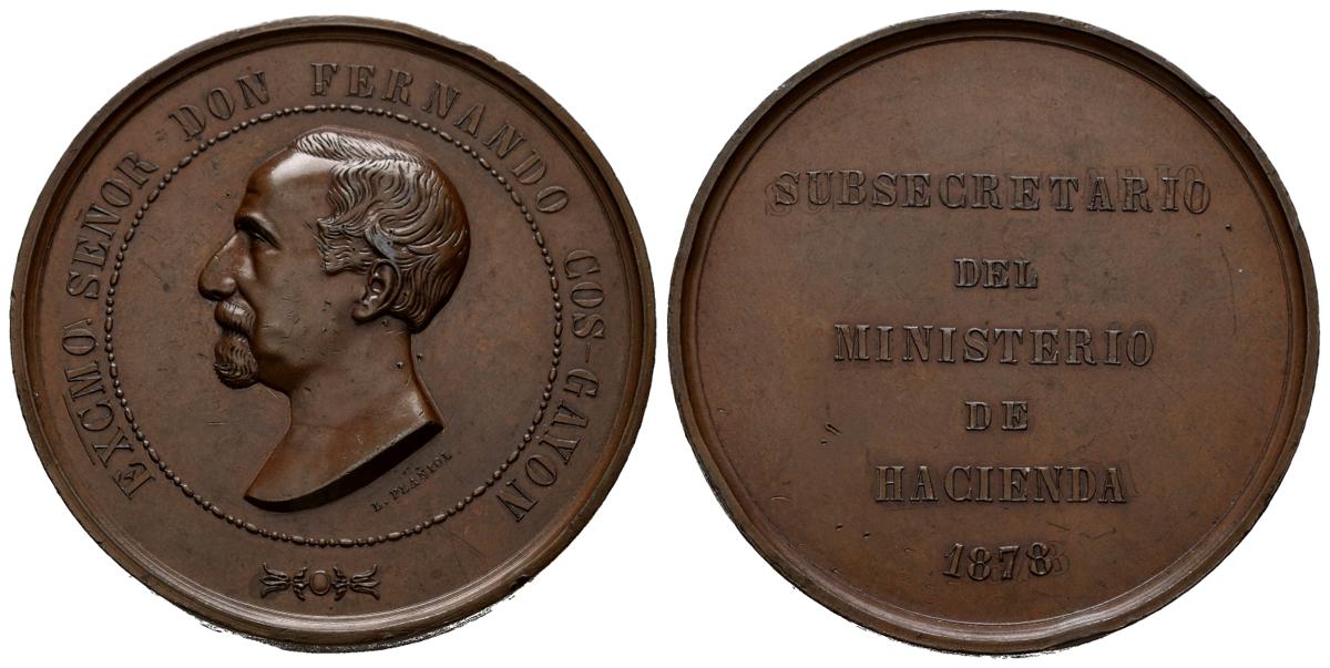 ALFONSO XII (1874-1885). D. Fernando Cos-Gayón. Subsecretario del Ministerio de Hacienda. (Ae. 91,15g/55mm). 1878. Madrid. Grabador: L. Plañiol. (Vives 483). MBC+.
