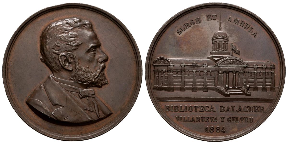 ALFONSO XII (1874-1885). Biblioteca Balaguer. Villanueva y Geltrú. (Ae. 58.40g/50mm). 1884. EBC. Golpecito en el canto.Obra del arquitecto Jeroni Granell, la biblioteca fue construida entre 1882 y 1884 con la intención de ser un lugar de aprendizaje multidisciplinar, abierto y sin exclusión a ningún tipo de ciudadano. Es por tanto, el más claro y probablemente primer ejemplo, de biblioteca pública catalana. Entre sus primeros fondos cabe destacar un buen número de aportaciones que hizo el propio fundador, Víctor Balaguer, insigne escritor, periodista y político español y una de las destacadas figuras de la llamada “Renaixenca”.