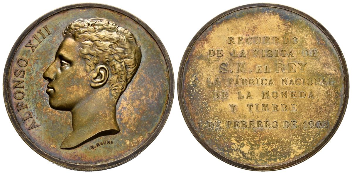 ALFONSO XIII (1885-1931). Visita de Alfonso XII a la Fábrica Nacional de Moneda y Timbre. (Ae. 57,45g/50mm). Bronce dorado. 1 de Febrero de 1904. Madrid. Grabador: Bartolomé Maura. (Vives 606 variante de metal). SC-. Pátina irisada. Rara.