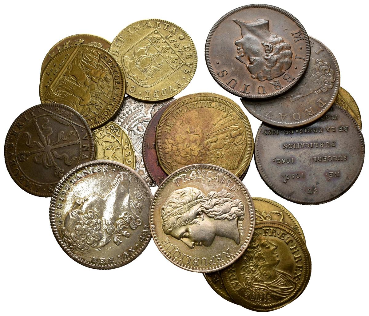 FRANCIA. Conjunto formado por 16 tokens franceses de diferentes épocas. El conjunto incluye piezas originales y alguna reacuñación moderna. Diferentes materiales así como estados de conservación. A EXAMINAR.