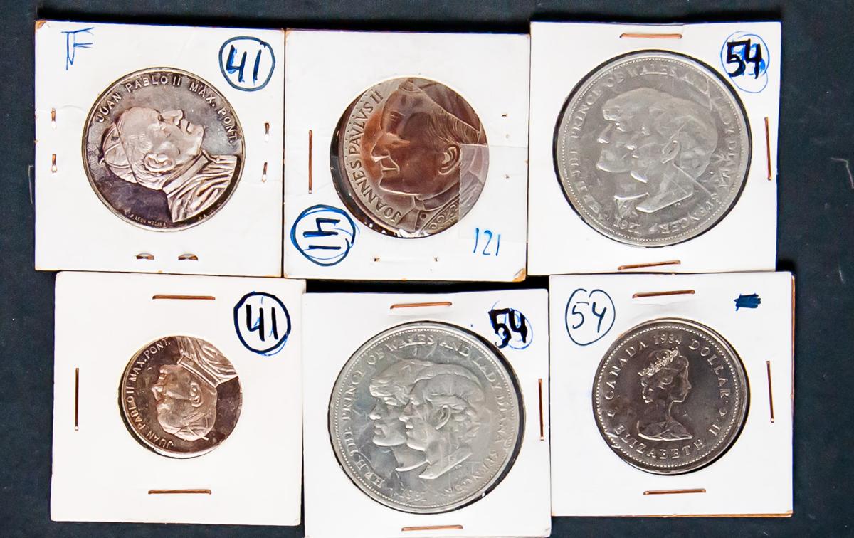 Conjunto de 6 piezas, 5 medallas, 3 de ellas de la Visita del Papa Juan Pablo II a España en 1982 y 2 conmemorativas de la Boda del Príncipe Carlos y Diana de Gales y 1 moneda de 1 Dollar de Canadá de 1984. Diferentes estados de conservación. A EXAMINAR.