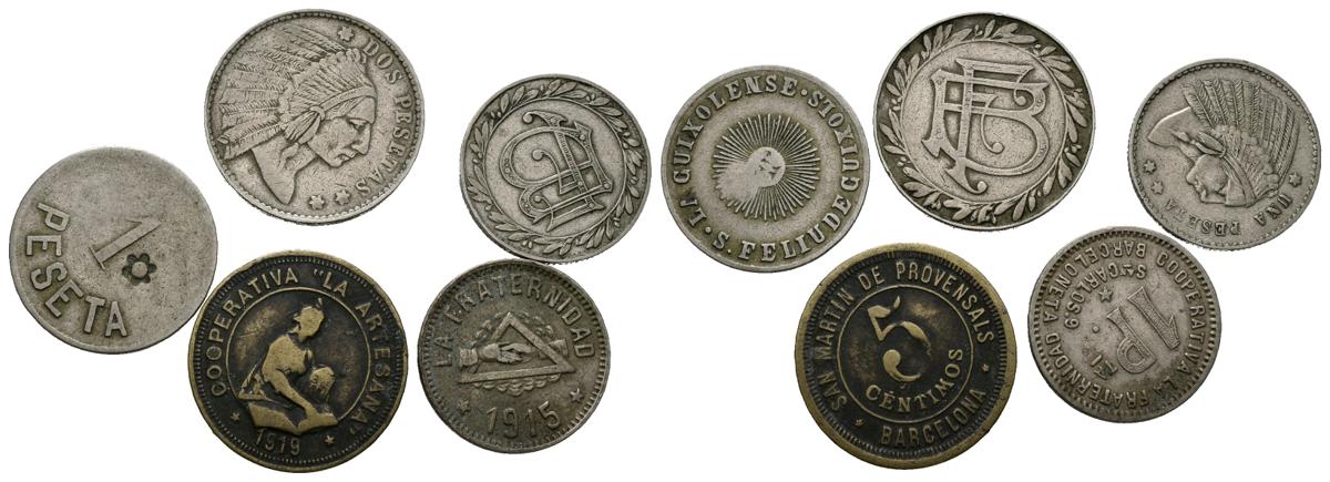 Conjunto de 5 fichas o token de casinos y cooperativas principalmente catalanas. Diferentes estados de conservación. A EXAMINAR.