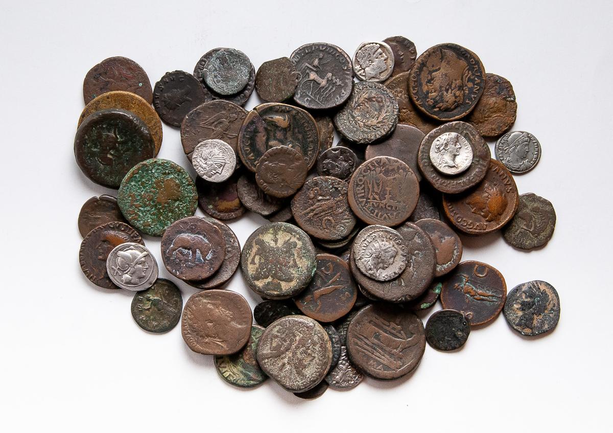 REPUBLICA e IMPERIO ROMANO. Interesante colección de cobres en diferentes módulos y platas romanas de diversos emperadores y épocas. 71 piezas en total. Diferentes estados de conservación. A EXAMINAR