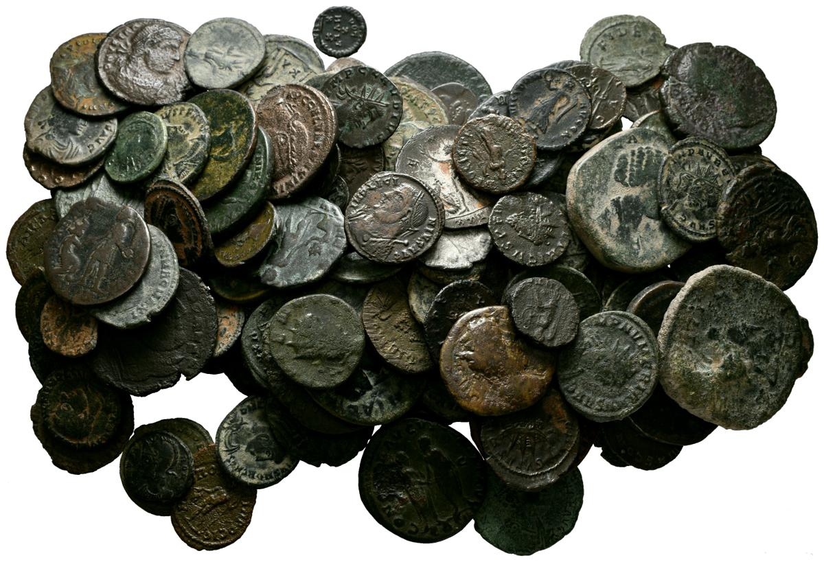IMPERIO ROMANO. Interesante conjunto compuesto por 130 monedas de bronce de distintos emperadores romanos, en su gran mayoría Antoninianos, algunos con ligeros restos de plateado original. A EXAMINAR.