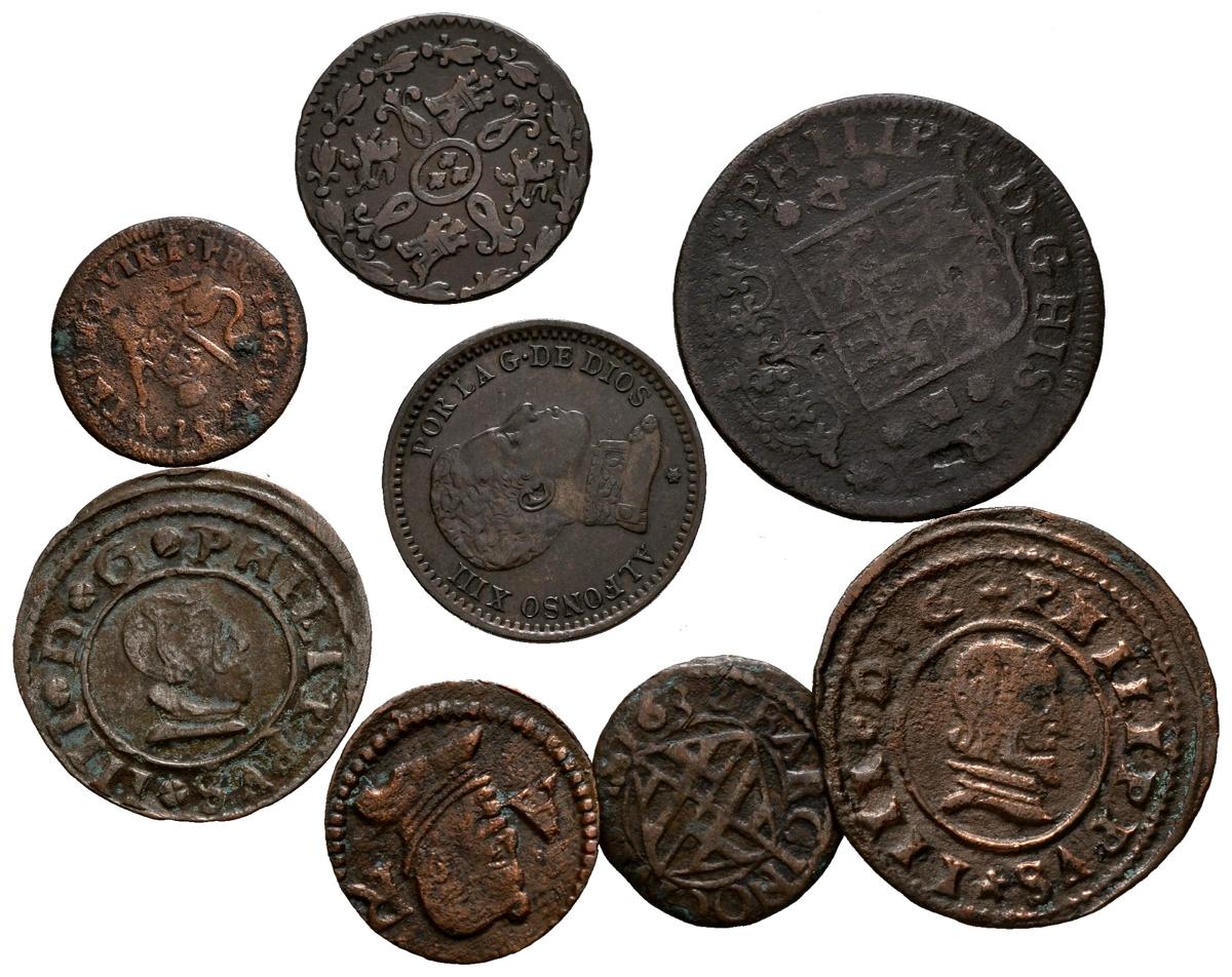 MONARQUIA ESPAÑOLA Y CENTENARIO DE LA PESETA. Lote compuesto por 8 monedas de cobre de los reyes: Felipe IV, Felipe V, Fernando VI, Fernando VII y Alfonso XIII, destacando 4 monedas de Felipe IV, entre las que hay 2 Ardits de Barcelona, una moneda de 8 Maravedís de Madrid y una moneda de 16 Maravedís de Córdoba. A EXAMINAR.