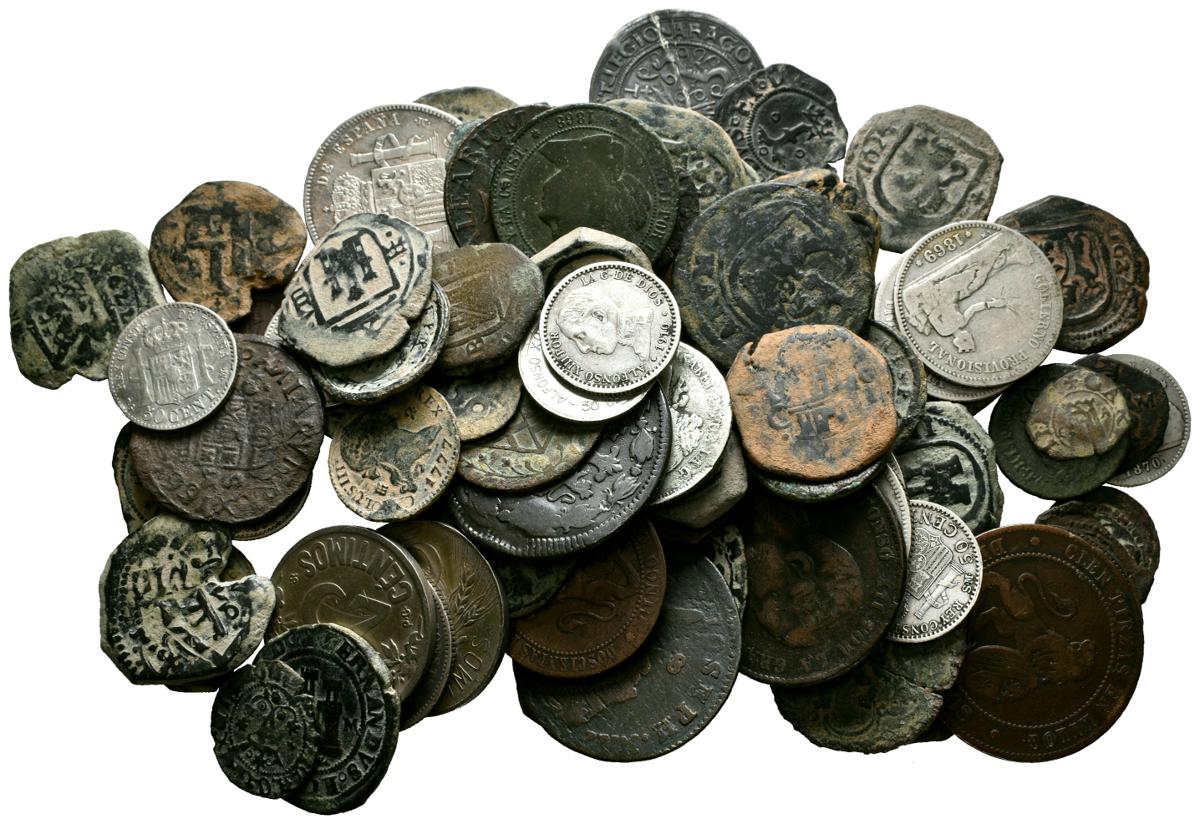 MONARQUIA ESPAÑOLA, CENTENARIO DE LA PESETA y II REPUBLICA. Lote compuesto por 83 monedas de distintos Reyes Españoles, algunas de ellas bronces resellados, destaca un Real de los Reyes Católicos reparado. A EXAMINAR.