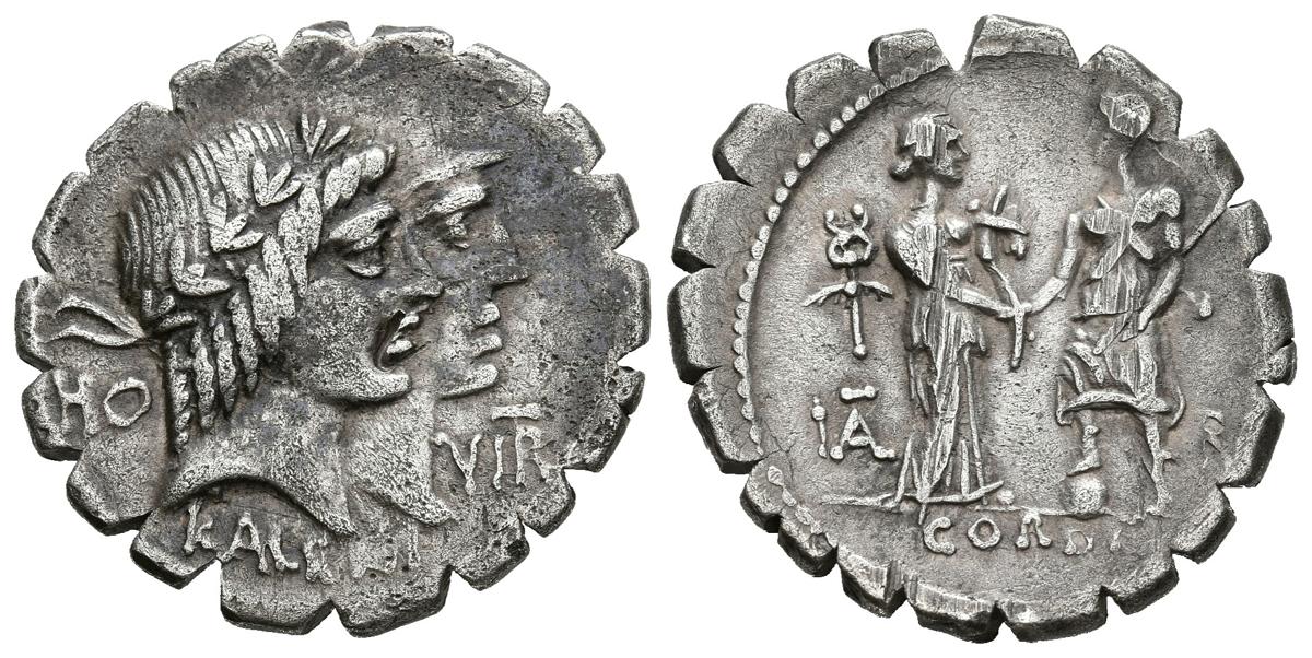 GENS FUFIA. Denario. (Ar. 3,90g/21mm). 70 a.C. Ceca incierta italiana. (Crawford 403/1; FFC 725). Anv: Cabezas de Honus y Virtus a derecha, detrás: HO, delante: VIRT, debajo: KALENI. Rev: Italia estante a derecha con cornucopia, dando la mano a Roma estante a izquierda portando cetro y apoyando el pie sobre globo, en campo caduceo, a la izquierda: ITAL, a derecha: RO, en exergo: CORDI. MBC+. Bonito ejemplar.