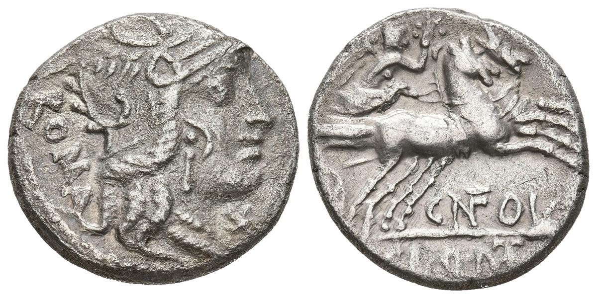 GENS FULVIA. Denario. (Ar. 3,51g/18mm). 117-111 a.C. Norte de Italia. (Crawford 284/1b; FFC 726). Anv: Cabeza de Roma a derecha, delante estrella, detrás leyenda: ROMA. Rev: Victoria con corona de laurel sobre biga a derecha, debajo leyenda: CN FOVL, en exergo: M CAL Q MET. MBC.