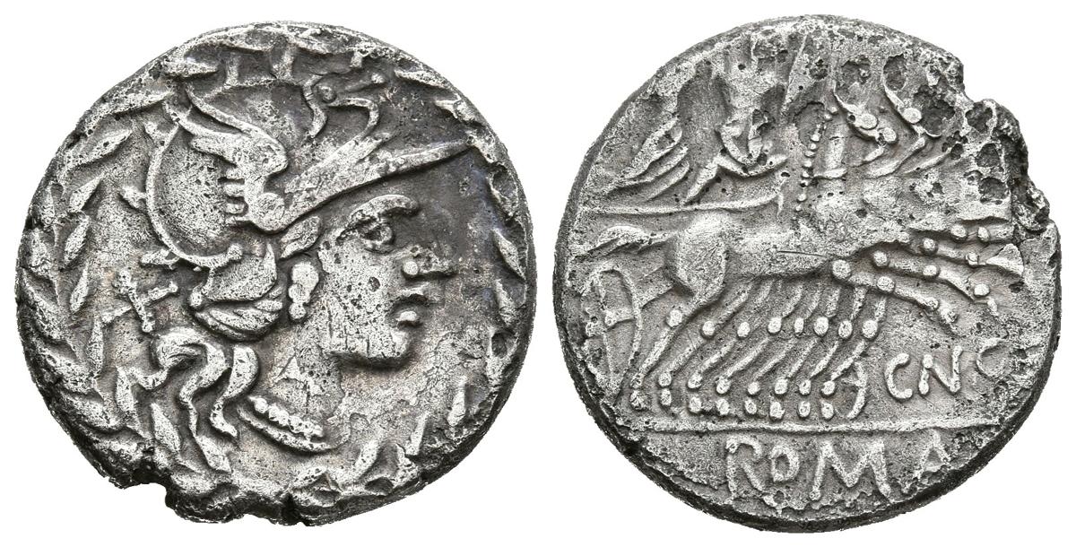 GENS GELIA. Denario. (Ar. 3,33g/17mm). 138 a.C. Roma. (Crawford 232/1; FFC 742). Anv: Cabeza de Roma a derecha, detrás X, todo dentro de láurea. Rev: Marte portando escudo y Nerio Neriensis conduciendo cuádriga a derecha, debajo leyenda: CN GE, en exergo: ROMA. MBC.