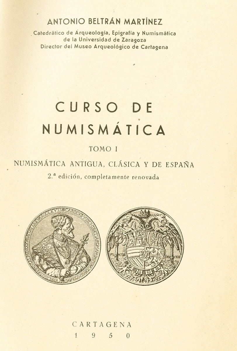 CURSO DE NUMISMATICA, Tomo I. Antonio Beltrán Martínez, Cartagena. 1950. Encuadernado.
