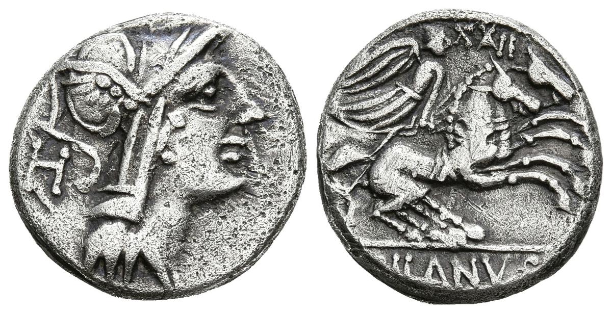 GENS JUNIA. Denario. (Ar. 3,88g/16mm). 91 a.C. Roma. (Crawford 337/3; FFC 790). Anv: Cabeza de Roma a derecha, detrás: H. Rev: Victoria conduciendo biga a derecha, encima: XXII, en exergo: D SILANVS/ROMA. MBC.