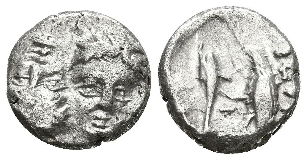 MOESIA, Istros. Dióbolo. (Ar. 1,26g/11mm). 400-350 a.C. (SNG Copenhagen 20). Anv: Cabezas masculinas de frente invertidas. Rev: Aguila agarrando a delfín a izquierda encima leyenda griega, entre ellos monograma griego. MBC.