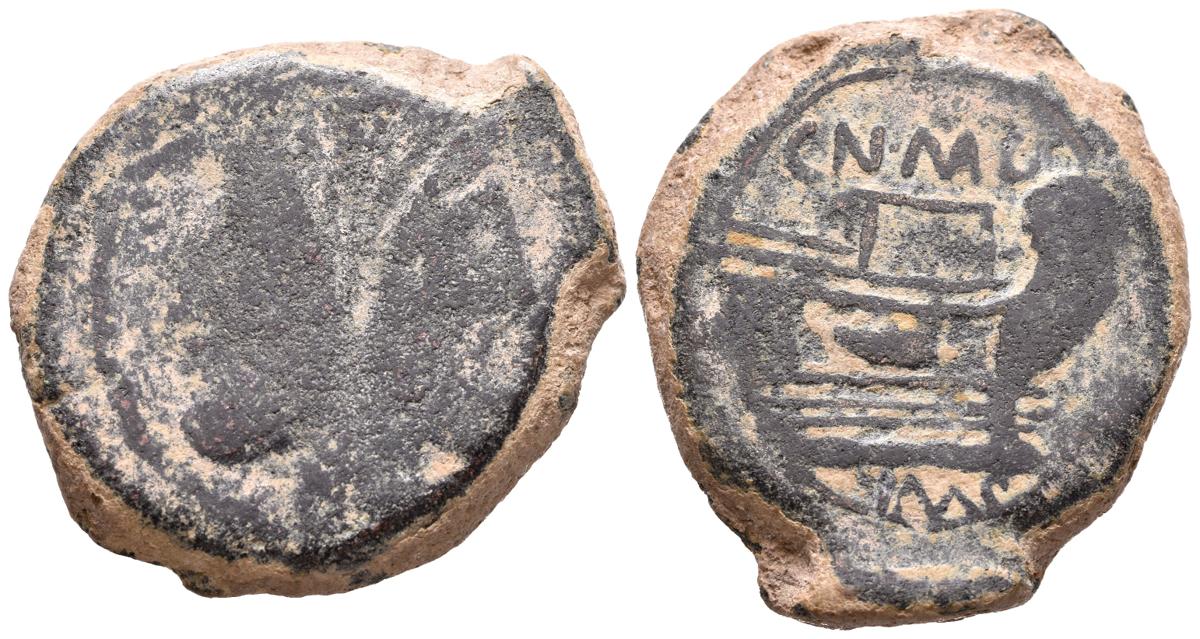 POMPEYO, el Grande. As. (Ae. 33,86g/36mm). 45 a.C. (Crawford 471/1). Anv: Cabeza de Jano bifronte, encima I. Rev: Proa a derecha, debajo leyenda: IMP, encima: CN MAG. MBC-/MBC. Escaso.