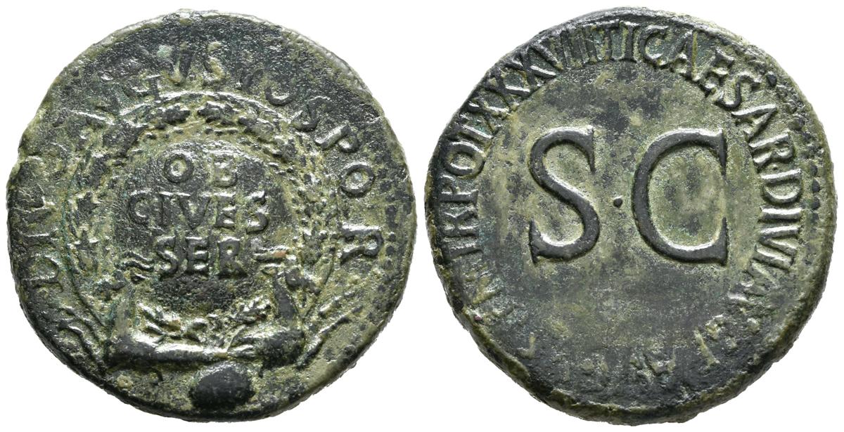 TIBERIO. Sestercio. (Ae. 24,71g/35mm). 35-36 d.C. (RIC 63). Anv: Escudo con inscripción: OB/CIVES/SER, dentro de corona de laurel, debajo dos capricornios cruzados, alrededor leyenda: DIVO AVGVSTO SPQR. Rev: SC, alrededor leyenda: TI CAESAR DIVI AVG F AVGVST P M TR POT XXXVII. MBC+. Pátina verde. Raro.