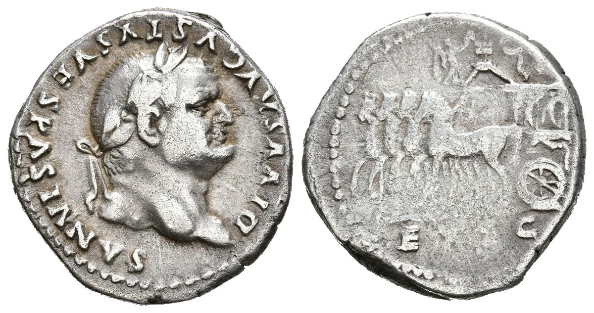 DIVO VESPASIANO. Denario. (Ar. 3,21g/19mm). 80-81 d.C. Roma. (RIC 361). Anv: Cabeza laureada de Vespasiano a derecha, alrededor leyenda: DIVVS AVGVSTVS VESPASIANVS. Rev: Cuádriga a izquierda tirando de un carro decorado con la figura de minerva portando lanza, encima cuádriga entre dos Victorias con palmas, en exergo: EXSC. MBC-.