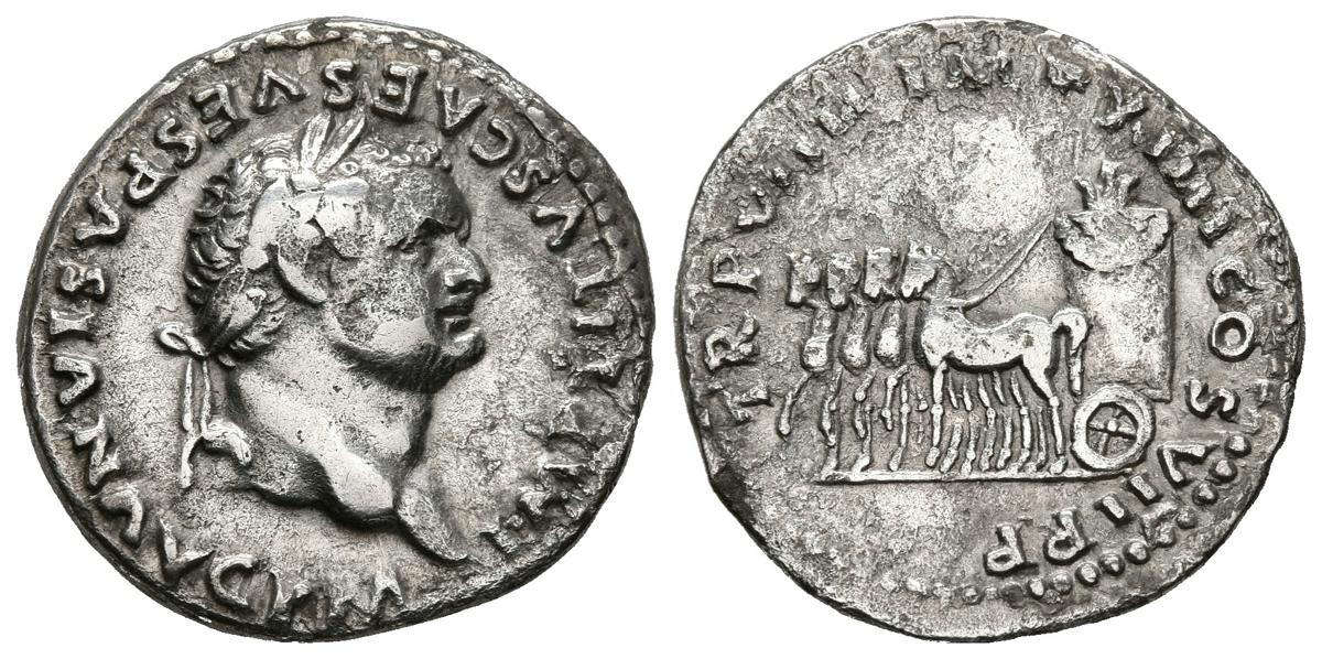 TITO. Denario. (Ar. 3,08g/18mm). 79 d.C. Roma. (RIC 8). Anv: Busto laureado de Tito a derecha, alrededor leyenda: IMP TITVS CAES VESPASIAN AVG P M. Rev: Cuádriga avanzando lentamente a izquierda portando alter decorado con guirnalda, alrededor leyenda: TR P VIIII IMP XIIII COS VII P P. MBC. Escaso.