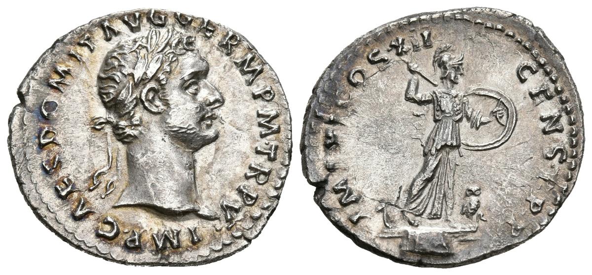 DOMICIANO. Denario. (Ar. 3,22g/20mm). 86 d.C. Roma. (RIC 427). Anv: Cabeza laureada de Domiciano a derecha, alrededor leyenda: IMP CAES DOMIT AVG GERM P M TR P V. Rev: Minerva estante sobre proa a derecha portando lanza y escudo, a sus pies búho, alrededor leyenda: IMP XI COS XII CENS P P P. EBC. Precioso ejemplar, escaso así.