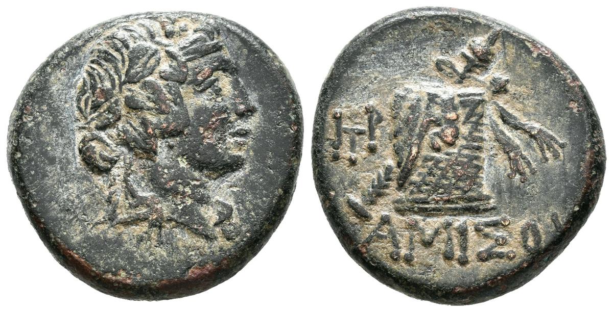 PONTOS, Amisos. Ae22. (Ae. 8,24g/22mm). 85-65 a.C. (SNG Stancomb 697). Anv: Cabeza laureada de Dionysos a derecha. Rev: Cesta y thyrsos, en campo monograma griego, debajo leyenda griega. MBC.