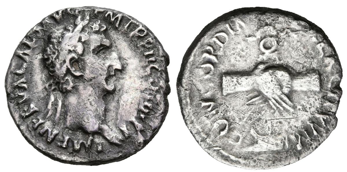 NERVA. Denario. (Ar. 2,83g/17mm). 79 d.C. Roma. (RIC 27). Anv: Cabeza laureada de Nerva a derecha, alrededor leyenda: IMP NERVA CAES AVG P M TR P II COS III P P. Rev: Manos entrelazadas, detrás águila sobre proa, alrededor leyenda: CONCORDIA EXERCITVM. MBC.