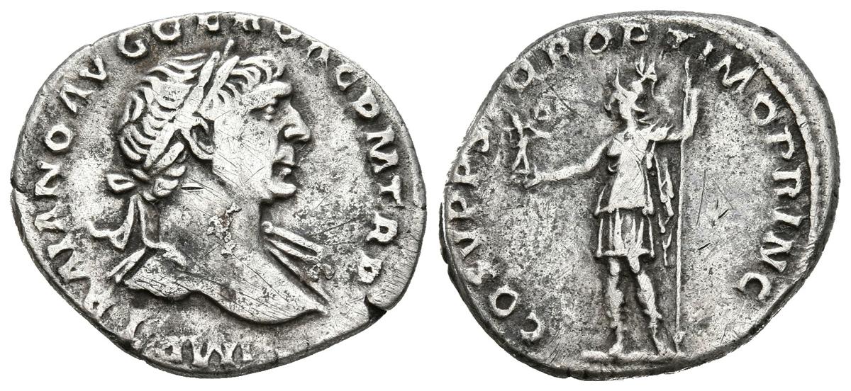 TRAJANO. Denario. (Ar. 3,55g/19mm). 110 d.C. Roma. (RIC 115). Anv: Cabeza laureada de Trajano a derecha, alrededor leyenda: IMP TRAIANO AVG GER DAC P M TR P. Rev: Roma estante a izquierda portando Victoria con corona de laurel y lanza, alrededor leyenda: COS V P P SPQR OPTIMO PRINC. MBC.