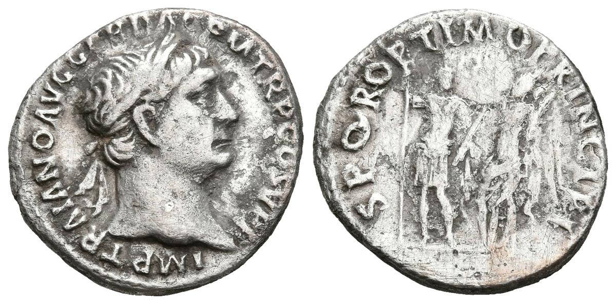 TRAJANO. Denario. (Ar. 2,96g/18mm). 103-104 d.C. Roma. (RIC 212). Anv: Busto laureado de Trajano a derecha, alrededor leyenda: IMP TRAIANO AVG GER DAC P M TR P COS V P P. Rev: Trajano estante con cetro coronado por Victoria, alrededor leyenda: S P Q R OPTIMO PRINCIPI. MBC-.