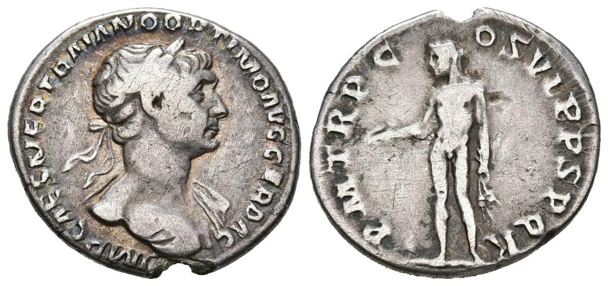 TRAJANO. Denario. (Ar. 2,89g/19mm). 114-117 d.C. Roma. (RIC 347). Anv: Busto laureado de Trajano a derecha con drapeado sobre hombro izquierdo, alrededor leyenda: IMP CAES NER TRAIANO OPTIMO AVG GER DAC. Rev: Genio estante a izquierda portando rama y patera, alrededor leyenda: P M TR P COS VI P P SPQR. MBC-.