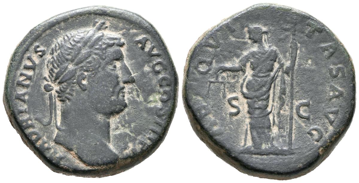 ADRIANO. Sestercio. (Ae. 31,01g/31mm). 134-138 d.C. Roma. (RIC 743). Anv: Cabeza laureada de Adriano a derecha, alrededor leyenda: HADRIANVS AVG COS III P P. Rev: Aequitas estante a izquierda portando escalas y cetro, entre: S-C, alrededor leyenda: AEQVITAS AVG. MBC-. Retocado.