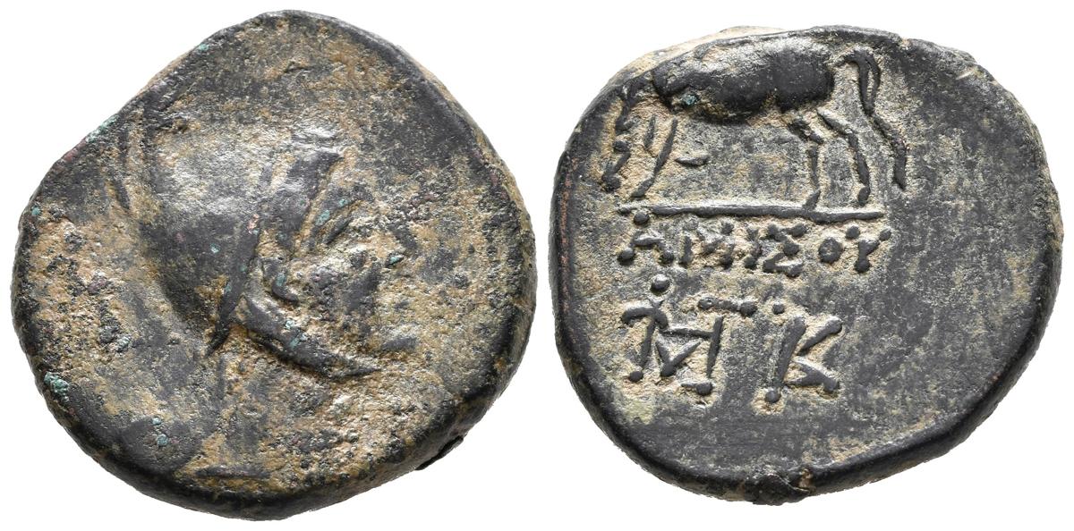 PONTOS, Amisos. Ae25. (Ae. 11,72g/25mm). 85-65 a.C. (SNG BM Black Sea 1212). Anv: Cabeza de Perseo con casco a derecha. Rev: Caballo pastando a izquierda, debajo leyenda griega. MBC-/MBC.