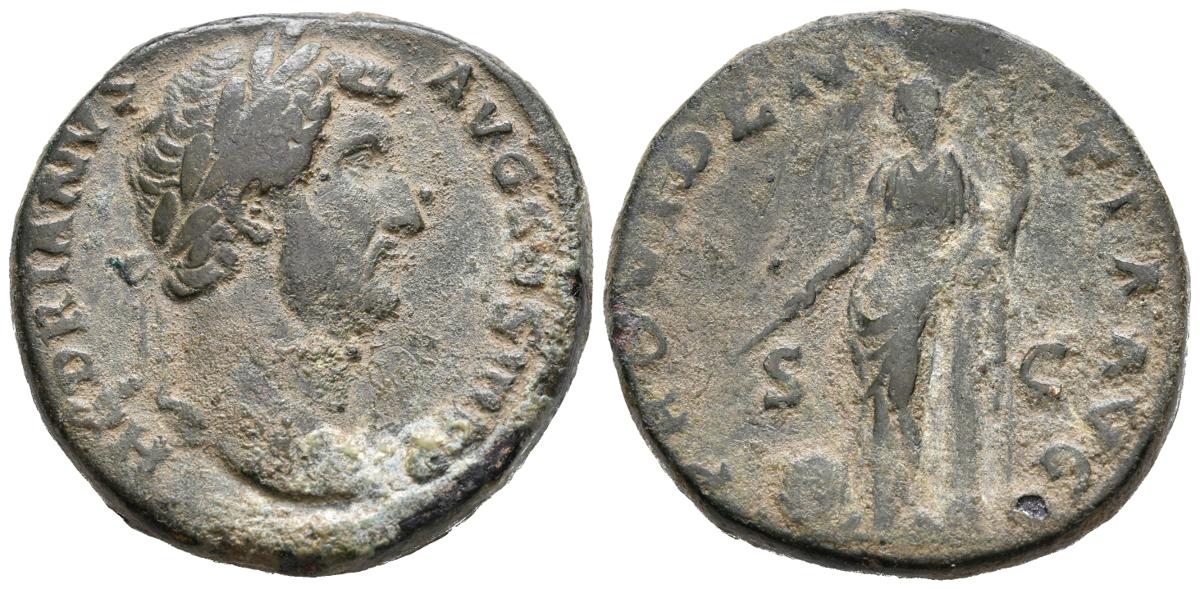 ADRIANO. Sestercio. (Ae. 30,20g/31mm). 134-138 d.C. Roma. (RIC 772). Anv: Cabeza laureada de Adriano a derecha, alrededor leyenda: HADRIANVS AVG COS III P P. Rev: Providentia estante a izquierda portando cornucopia y vara sobre globo, entre: S-C, alrededor leyenda: PROVIDENTIA AVG. MBC-.
