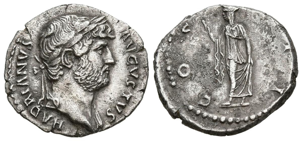 ADRIANO. Denario. (Ar. 3,14g/18mm). 125-128 d.C. Roma. (RIC 181). Anv: Cabeza laureada de Adriano a derecha, alrededor leyenda: HADRIANVS AVGVSTVS. Rev: Spes avanzando a izquierda portando flor, alrededor leyenda: COS III. MBC+.
