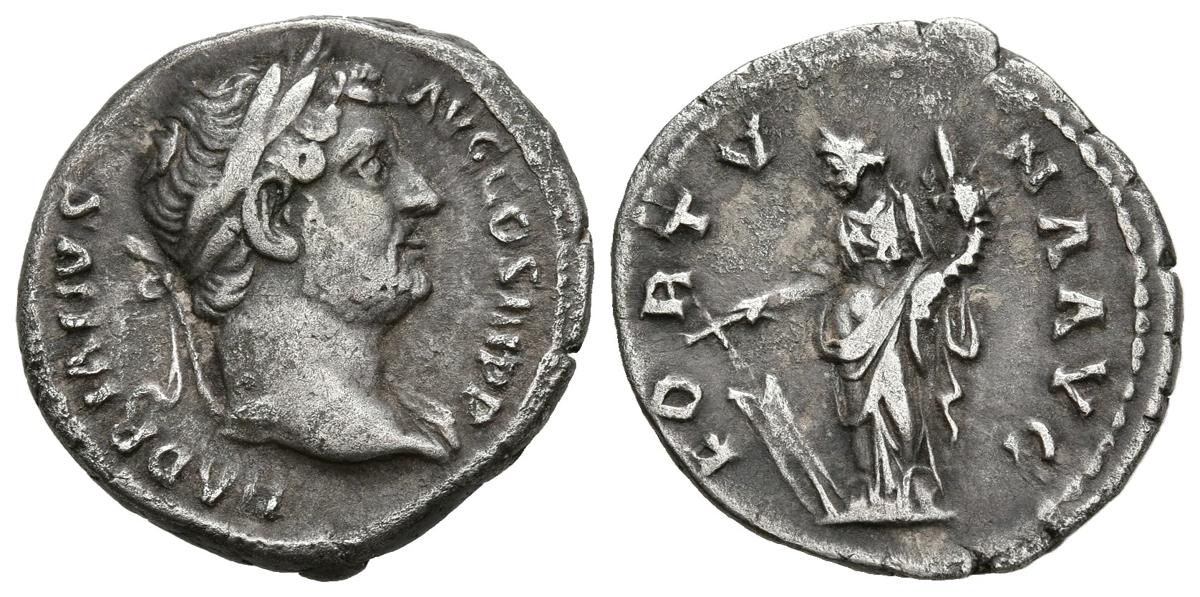 ADRIANO. Denario. (Ar. 2,94g/18mm). 134-138 d.C. Roma. (RIC 224d). Anv: Busto laureado de Adriano a derecha, alrededor leyenda: HADRIANVS AVG COS III P P. Rev: Fortuna estante a izquierda portando cetro y timón, alrededor leyenda: FORTVNA AVG. MBC.