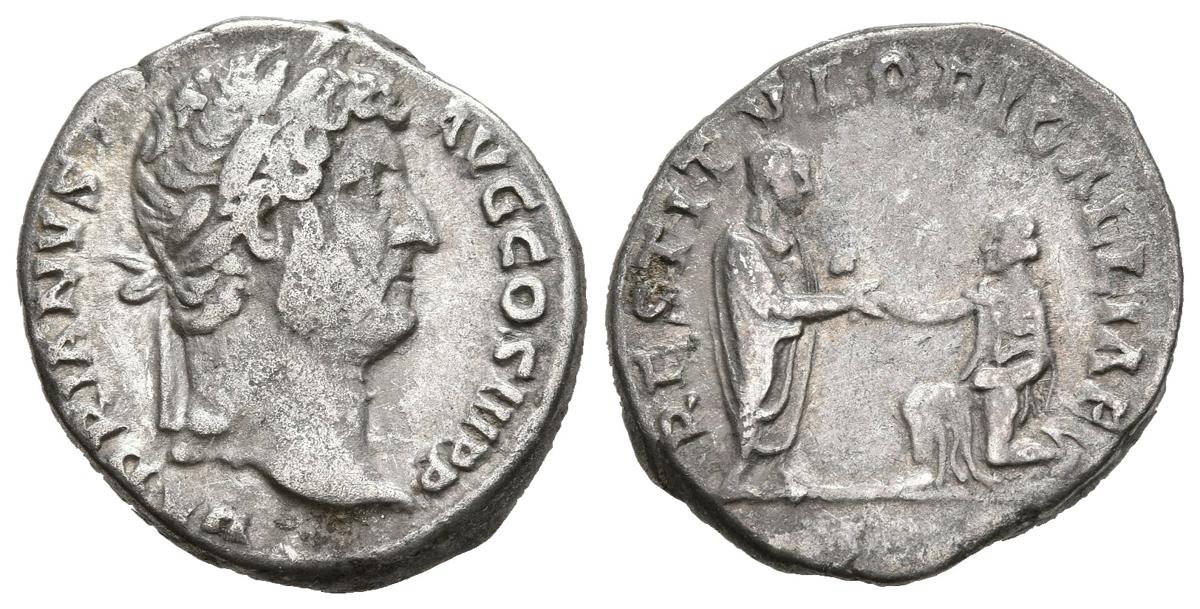 ADRIANO. Denario. (Ar. 3,57g/17mm). 134-138 d.C. Roma. (RIC 324). Anv: Busto laureado de Adriano a derecha, alrededor leyenda: HADRIANVS AVG COS III P P. Rev: Adriano estante a derecha levantando a Galia arrodillada a izquierda, alrededor leyenda: RESTITVTORI GALLIAE. MBC.