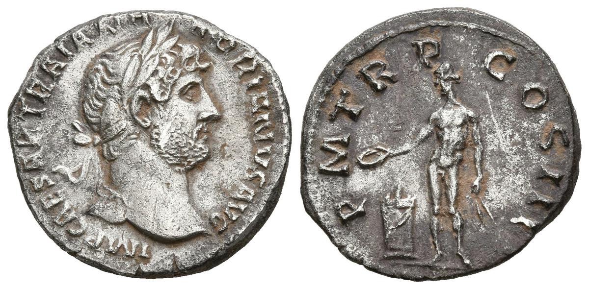 ADRIANO. Denario. (Ar. 3,39g/18mm). 119-122 d.C. Roma. (RIC 533). Anv: Cabeza laureada de Adriano a derecha, alrededor leyenda: IMP CAESAR TRAIAN HADRIANVS AVG. Rev: Genio estante a izquierda portando patera sobre altar y espigas, alrededor leyenda: P M TR P COS III. MBC+.