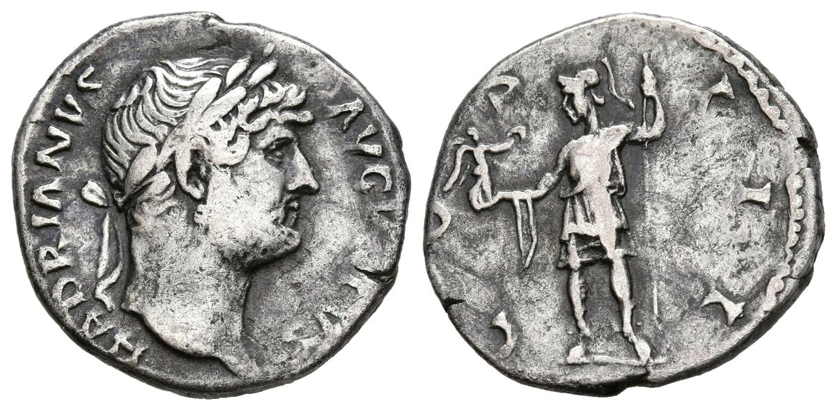 ADRIANO. Denario. (Ar. 3,31g/18mm). 125-128 d.C. Roma. (RIC 722). Anv: Cabeza laureada de Adriano a derecha, alrededor leyenda: HADRIANVS AVGVSTVS. Rev: Roma estante a izquierda portando Victoria con corona de laurel y lanza, alrededor leyenda: COS III. MBC-.