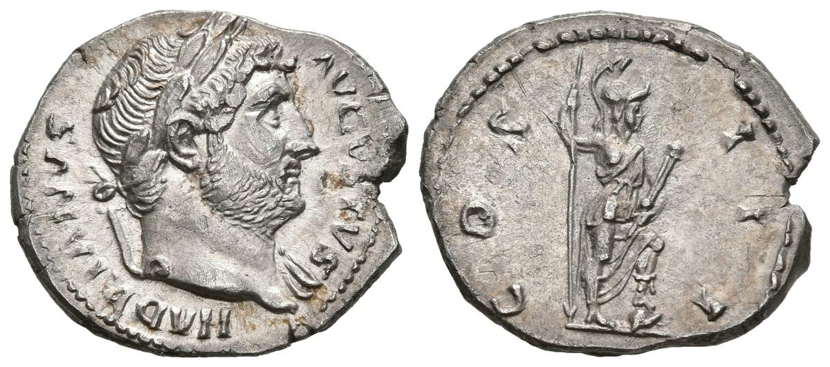 ADRIANO. Denario. (Ar. 3,39g/19mm). 125-128 d.C. Roma. (RIC No cita). Anv: Busto laureado de Adriano a derecha con drapeado sobre hombro izquierdo, alrededor leyenda: HADRIANVS AVGVSTVS. Rev: Marte estante a derecha con pie sobre casco portando lanza y parazonium, alrededor leyenda: COS III. EBC. Cospel faltado. Precioso y raro ejemplar.