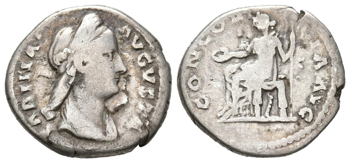 SABINA. Denario. (Ar. 3,12g/17mm). 128-137 d.C. Roma. (RIC 391). Anv: Busto diademado y drapeado de Sabina a derecha, alrededor leyenda: SABINA AVGVSTA. Rev: Concordia sentado a izquierda portando cetro y patera, alrededor leyenda: CONCORDIA AVG. MBC-. Hojita en anverso.
