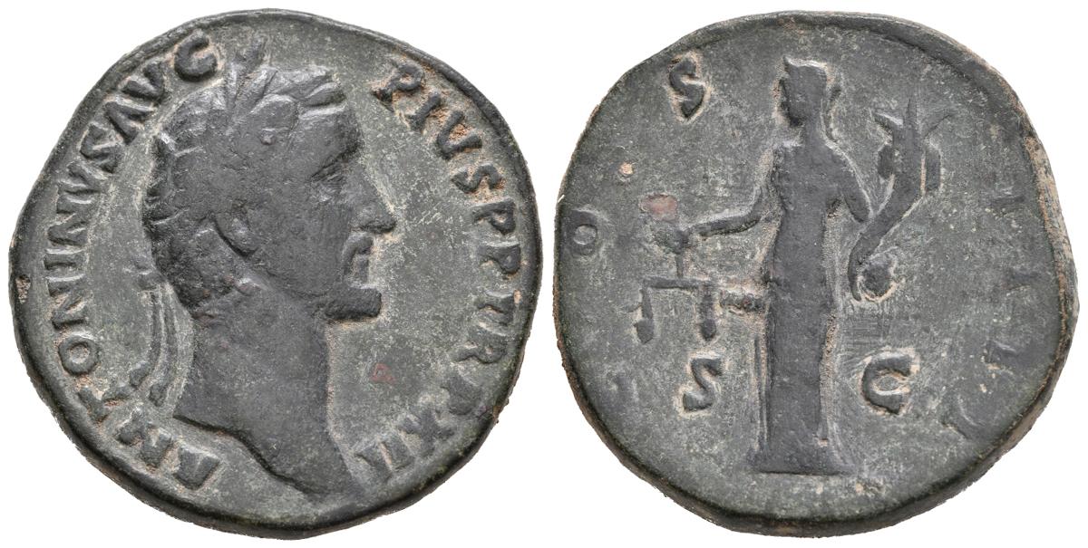 ANTONINO PIO. Sestercio. (Ae. 24,09g/31mm). 148-149 d.C. Roma. (RIC 855). Anv: Cabeza laureada de Antonino Pío a derecha, alrededor leyenda: ANTONINVS AVG PIVS P P TR P XII. Rev: Aequitas estante a izquierda portando escalas y cornucopia, entre: S-C, alrededor leyenda: COS IIII. BC+. Limpiado.
