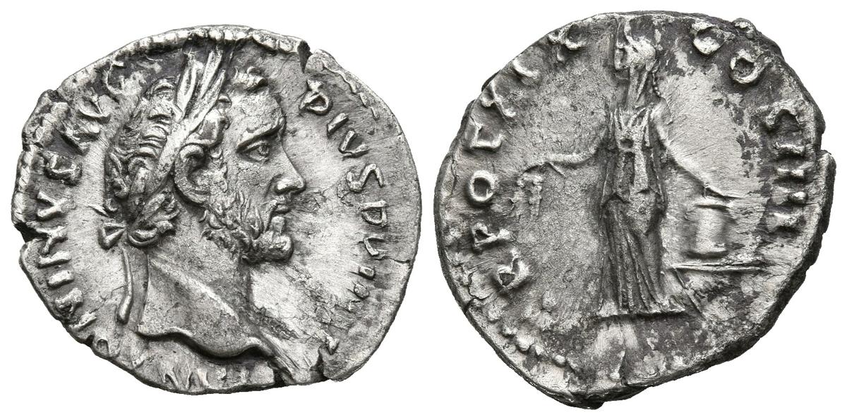 ANTONINO PIO. Denario. (Ar. 3,19g/18mm). 155-156 d.C. Roma. (RIC 249). Anv: Cabeza laureada de Antonino Pío a derecha, alrededor leyenda: ANTONINVS AVG PIVS P P IMP II. Rev: Annona estante a izquierda portando espigas, detrás modio sobre proa, alrededor leyenda: TR POT XIX COS IIII. MBC+.
