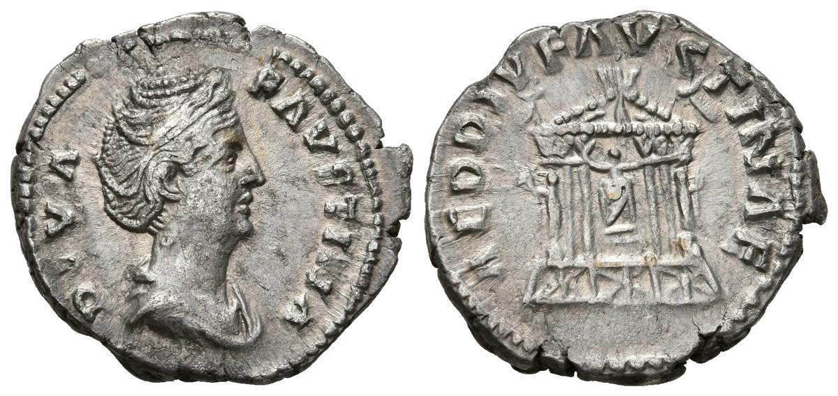 FAUSTINA I. Denario. (Ar. 3,05g/18mm). 140-141 d.C. Roma. (RIC 343). Anv: Cabeza diademada y drapeada de Faustina I a derecha, alrededor leyenda: DIVA FAVSTINA. Rev: Templo hexástilo con estatua de Faustina I sentada, alrededor leyenda: AED DIV FAVSTINAE. MBC+.